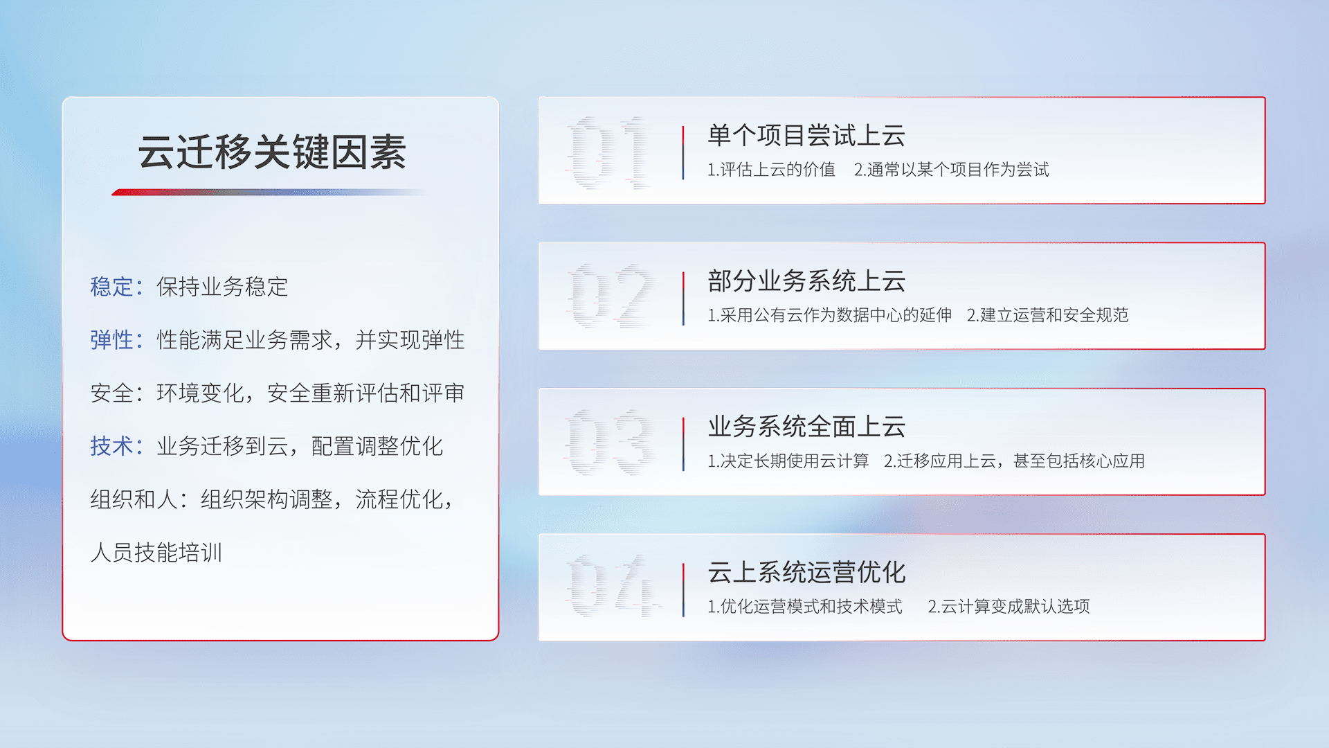 结合实际业务,,,,从规划设计、、、、云平台选型、、云原生改造、、数据迁移、、、、集成交付,,,,迁移全过程为客户识别最佳上云路径,,,,做好风险识别管理,,,设计网络架构、、、身份权限、、、、安全审计合规、、、、操作审计、、日志审计、、监控告警策略、、、多站点容灾设计等,,,对云上基础设施进行整体规划,,,提升IT治理水平,,,,以满足弹性、、、高可用、、、高性能的需求。。。
