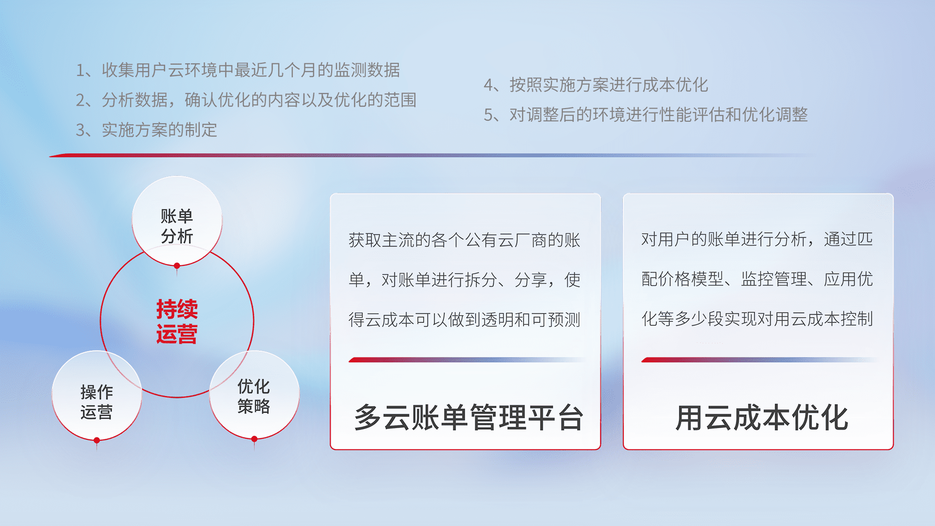 通过多云纳管,,,,以统一的资源数据模型把客户的云资源进行抽象和封装,,进而实现对多云资源的统一操作,,保障云资源管理的可靠性、、、稳定性与可用性。。。量身定制化运维内容,,,配置、、、开发运维、、、、补丁管理、、、备份、、、、监控、、认证和访问管理、、审计和日常巡检等,,,,保障在用云过程中的可靠度,,稳定度以及高可用率。。。