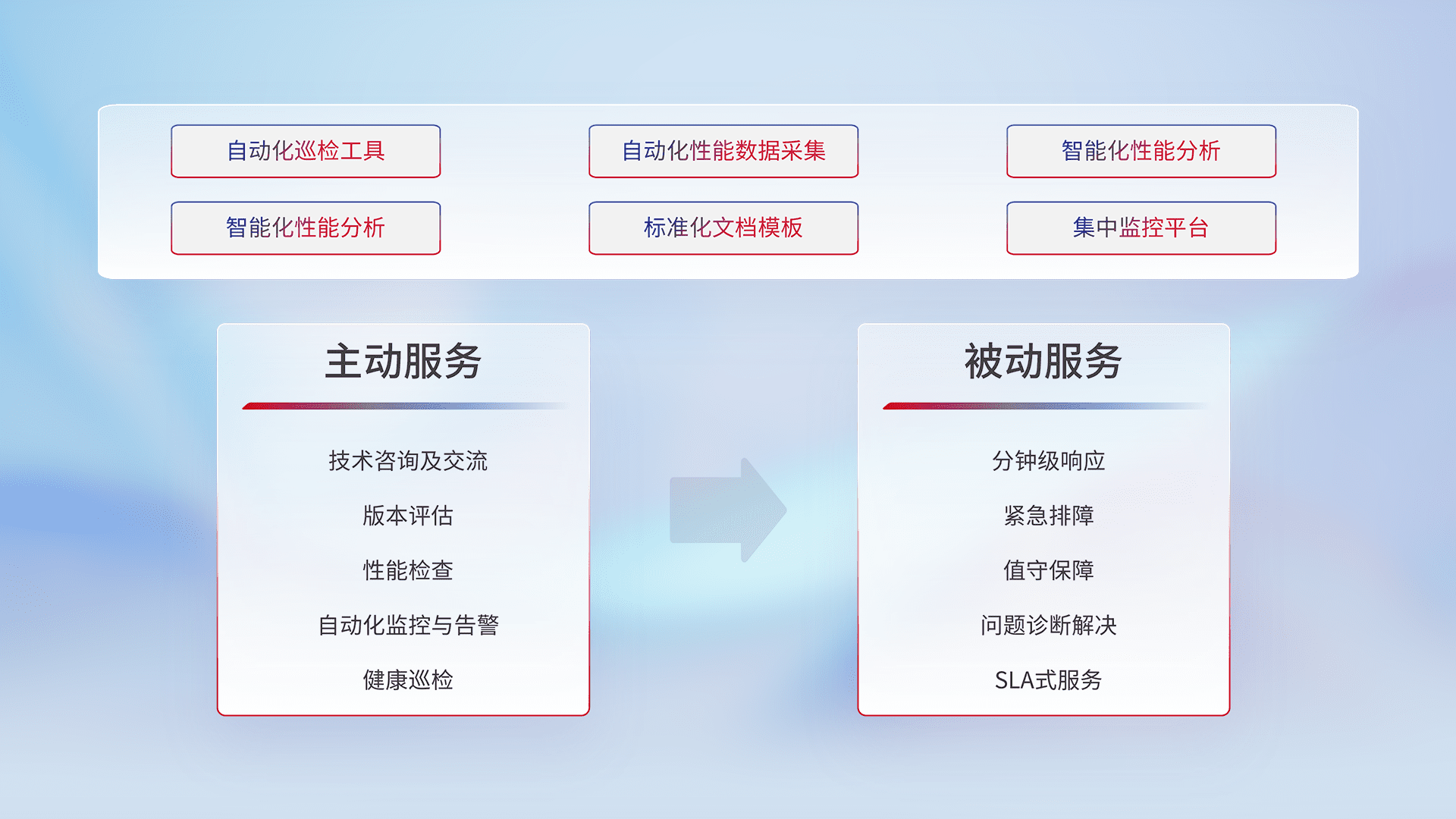 智能化工具和标准化文档,,,,保障服务质量,,,,提供主动服务(包含技术咨询、、版本评估、、性能检查、、自动化监控与告警、、、、健康巡检)和被动服务包含(分钟级响应、、、、紧急排障、、、、值守保障、、、、问题诊断解决、、、SLA服务)。。。